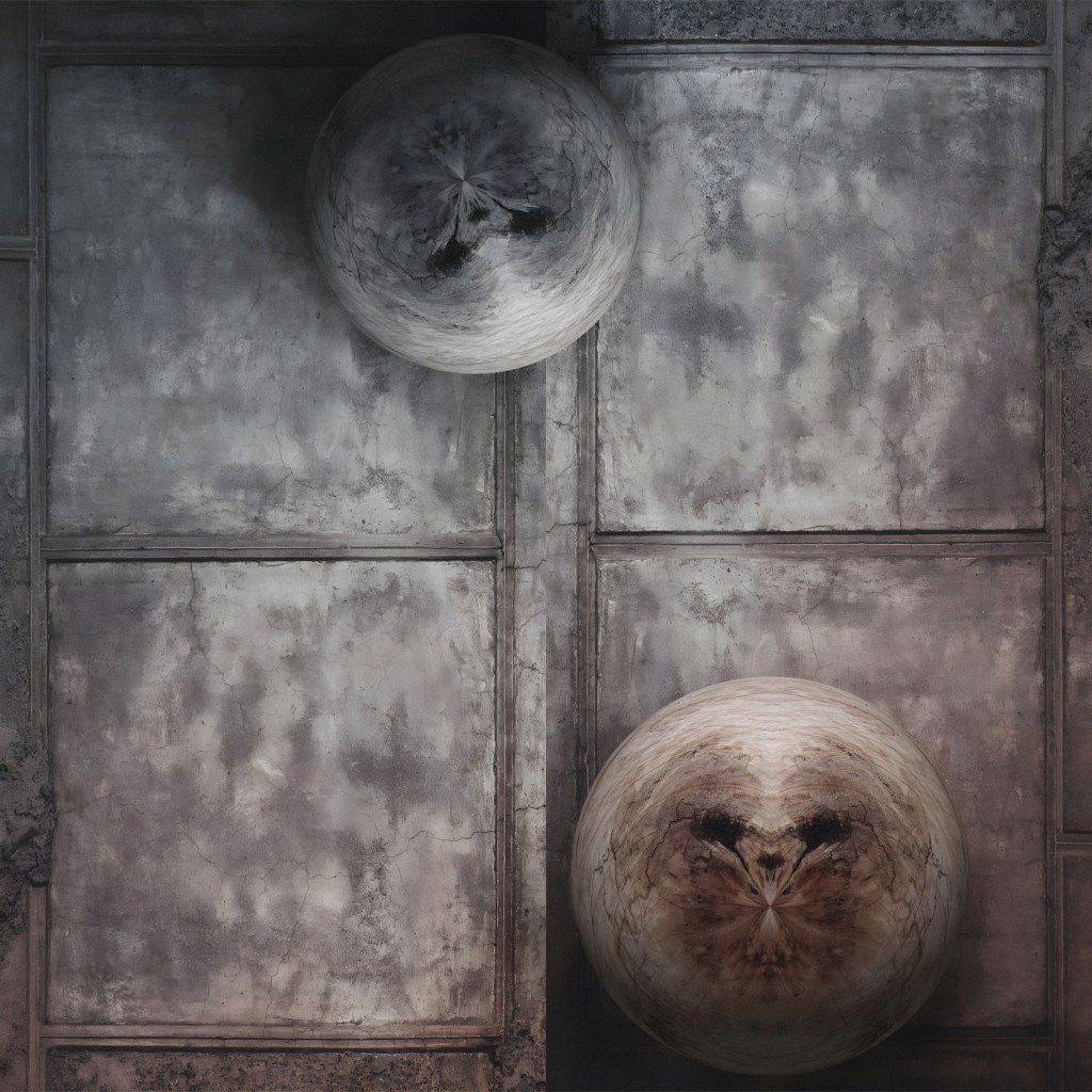 Two spheres emerge from a wall of weathered silence — one pale and ghostlike, the other darker, more rooted in the weight of memory. Together, they suspend in a space that is neither future nor past, but something in between. This is “Edge” — a meditation on liminality, on the spaces where transformation simmers, unseen.